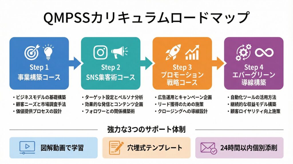 QMPSSのカリキュラムは、単なる「Instagramの伸ばし方」といった表面的なテクニックではありません。事業構築から集客、販売、そして自動化(エバーグリーン化)に至るまで、「一生使える本質的なマーケティングスキル」を体系的に学べるように設計されています。
