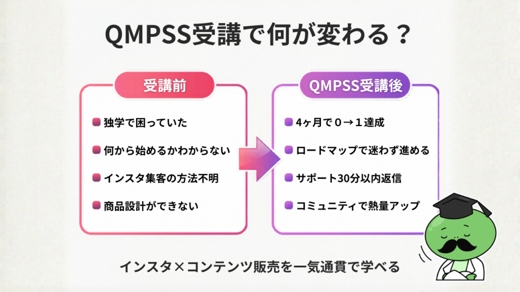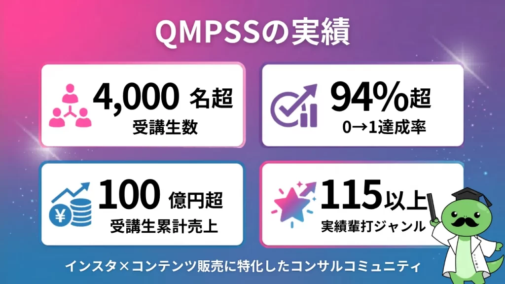 • QMPSSはインスタ×コンテンツ販売に特化したコンサルコミュニティで、受講生は4,000名超