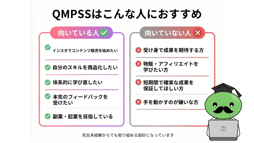 QMPSSはすべての人に向いているわけではありません。受講前に自分に合う講座かどうかを確認しておくことが、後悔のない選択につながります。