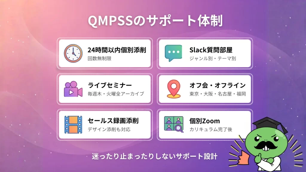 ただ、包括型のコンサルコミュニティの業界相場は一般的に50万〜200万円程度とされており、QMPSSはその中間帯に位置します。単なる動画教材ではなく、24時間以内の個別添削・月8回のライブセミナー・オフ会・セールス録画添削・デザイン添削など、幅広いサポートが含まれます