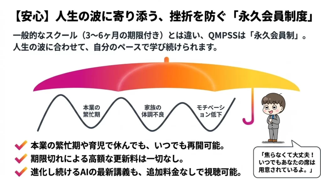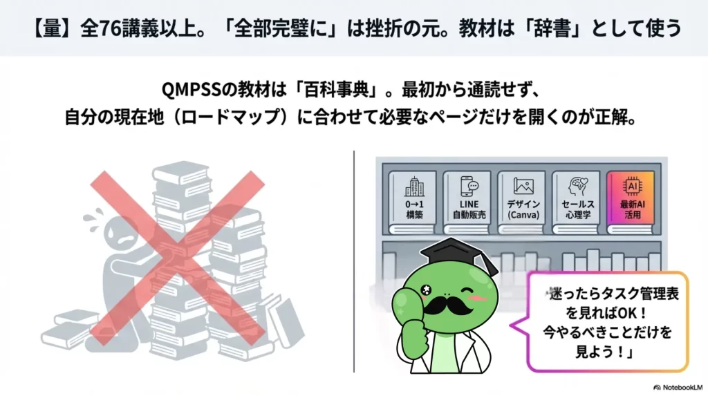 QMPSSにはタスク管理表とロードマップが用意されており、「今日やるべきこと」がひとつに絞られる設計になっています。全体のボリュームを見て焦る必要はないのです。イメージとしては、辞書を最初から最後まで読む必要がないのと同じ。必要なときに、必要なコースを開けばいい。永久会員制度があるので、自分のペースで進められます。