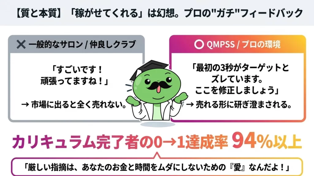 カリキュラムの完了率が0→1達成率に直結しているのは、まさにこの理由です。「カリキュラムを最後までやり切った人の94%が成果を出した」という数字は、裏を返せば「やり切らなければ成果は出ない」ということ。QMPSSは「稼がせてくれる場所」ではなく「稼ぐ力を身につける場所」です。この違いを理解しているかどうかで、入会後の行動量がまったく変わります。