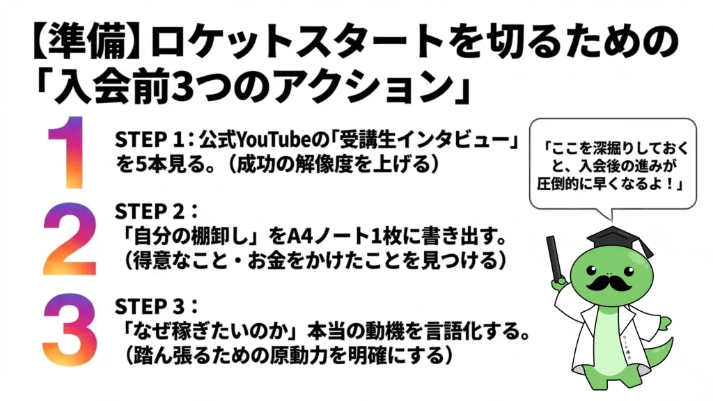 - YouTubeの対談動画を何本か見ておく: 250本以上公開されている受講生との対談動画を3〜5本見ておくだけで、「どんな人が」「どのくらいの期間で」「どんな成果を出しているか」のリアルなイメージが掴めます。