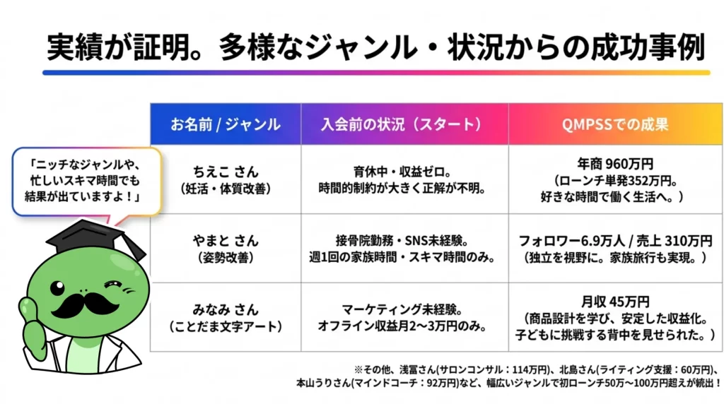 結論からお伝えします。2025〜2026年現在も、QMPSSでは複数の受講生が継続して成果を出しています。