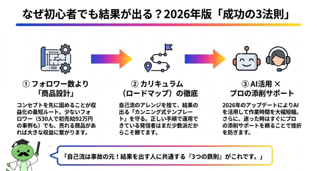 - 成果が出た受講生に共通するのは「フォロワー数より先に商品設計を固めた」「カリキュラムを自己流にせず進めた」の2点