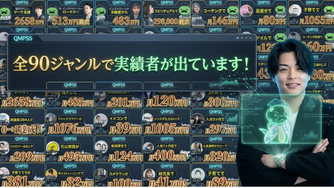 SNS運用代行だけでなく、美容、フィットネス、語学、ハンドメイドなど、多岐にわたる90以上のジャンルで、月商数百万円から数千万円規模の成功者を多数輩出しています。